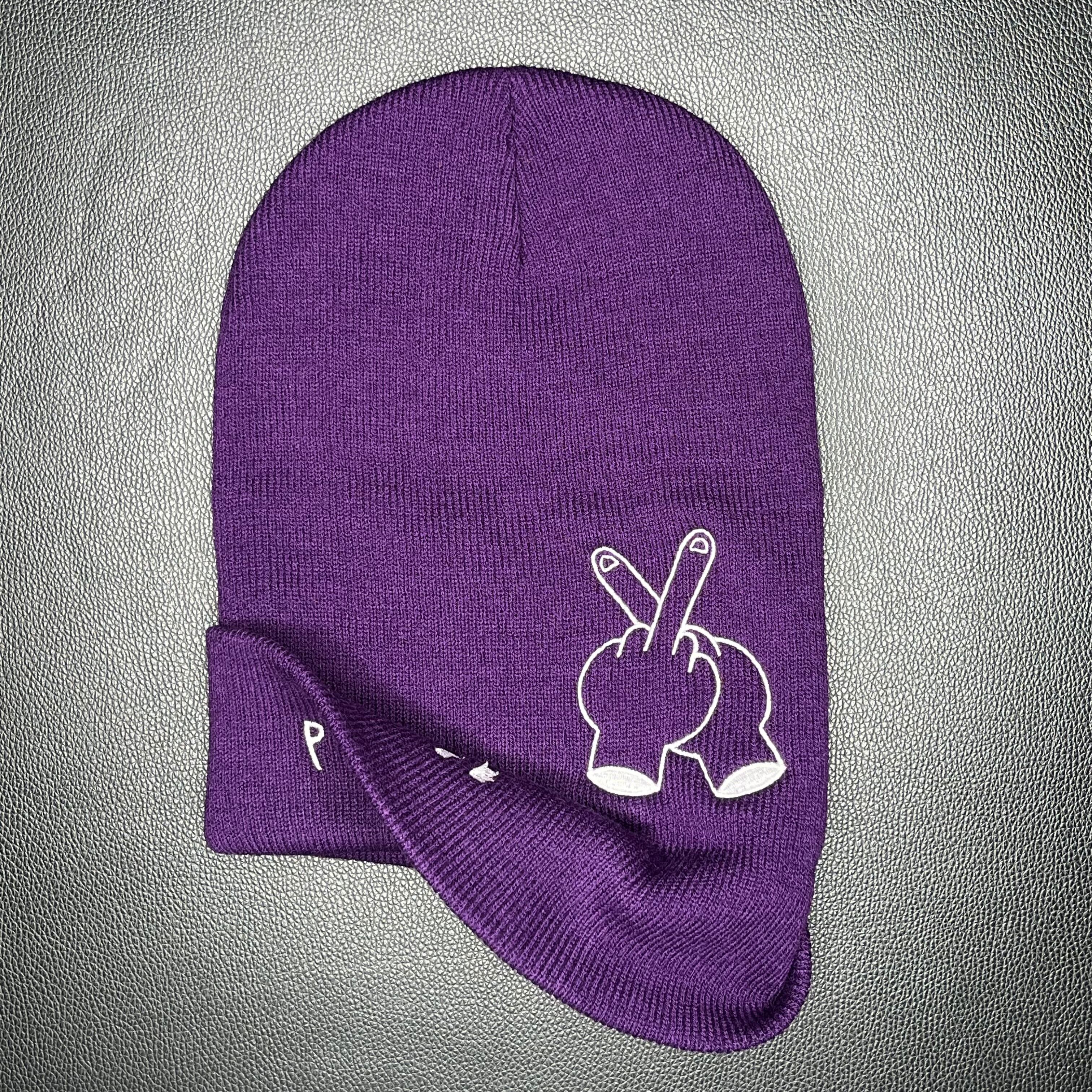 今回のオリジナルビーニーは、一見PEACEサインをしているかと思いきや、折り返し部分を開くとFUCKサインになった、ブラックユーモラスなアイテムです。